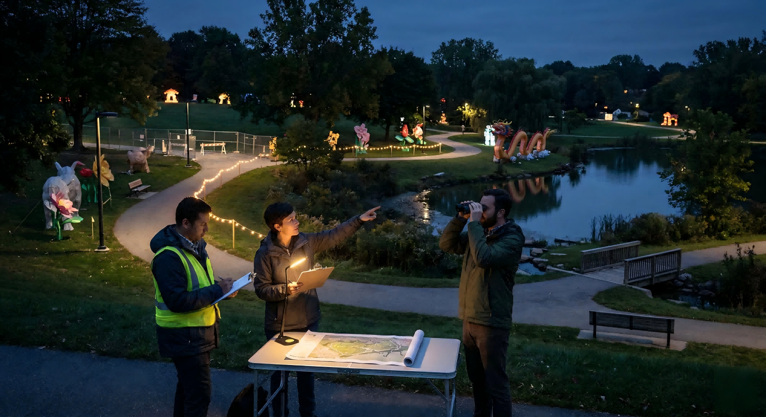 Parks behave differently after dark. Sightlines shorten, shadows become more prominent, slopes feel steeper, and some routes that appear comfortable during the day may feel unclear at night. This is why lantern show planning should begin with a nighttime reading of the site rather than relying only on daytime impressions.