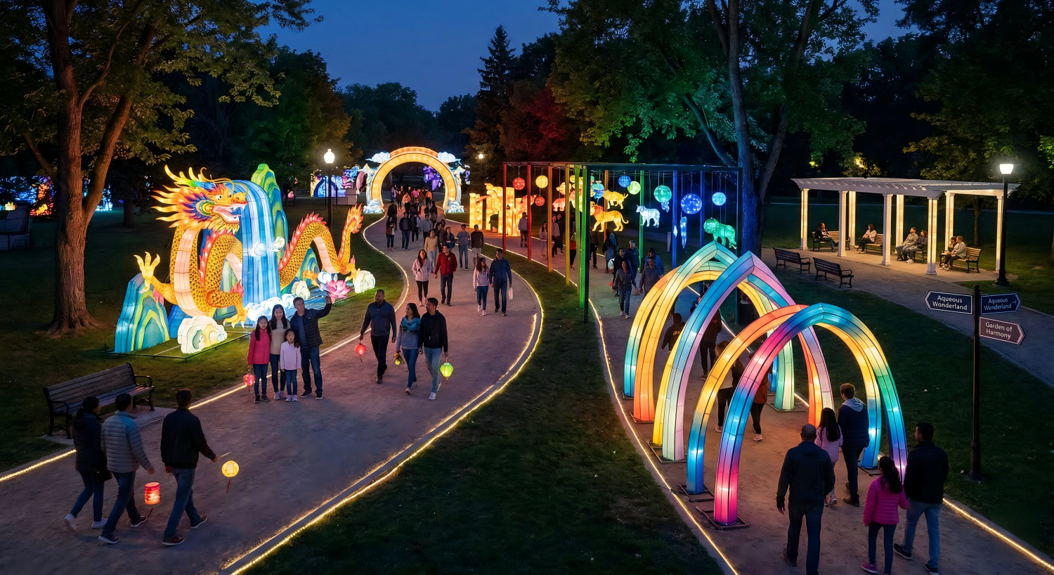 The most effective lantern shows do not force a generic layout onto every park. They adapt to the actual nighttime logic of the site.
